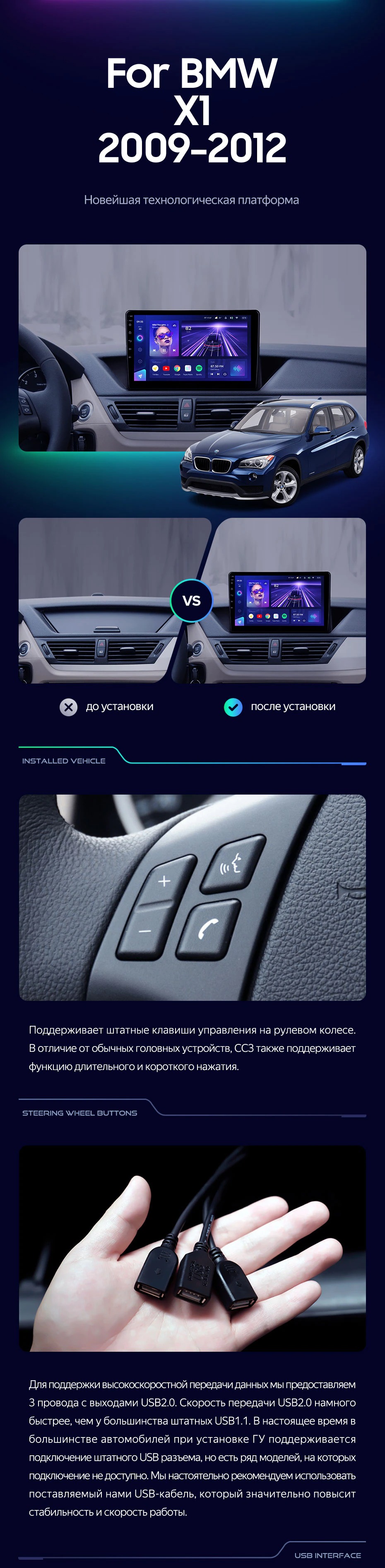 | USB | 3×USB 2.0 + USB 3.0 | Доп. аксессуары | Передняя/задняя AHD-камера, DVR-регистратор, TPMS, парковочный OBD, Type-C → HDMI |
