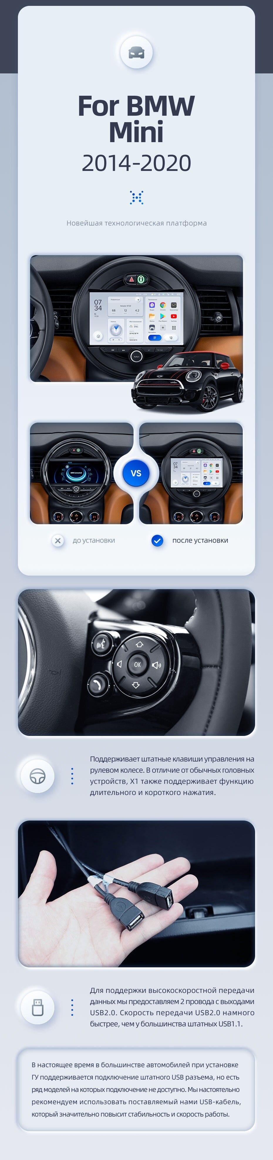 | USB | 3×USB 2.0 + USB 3.0 | Доп. аксессуары | Передняя/задняя AHD-камера, DVR-регистратор, TPMS, парковочный OBD, Type-C → HDMI |