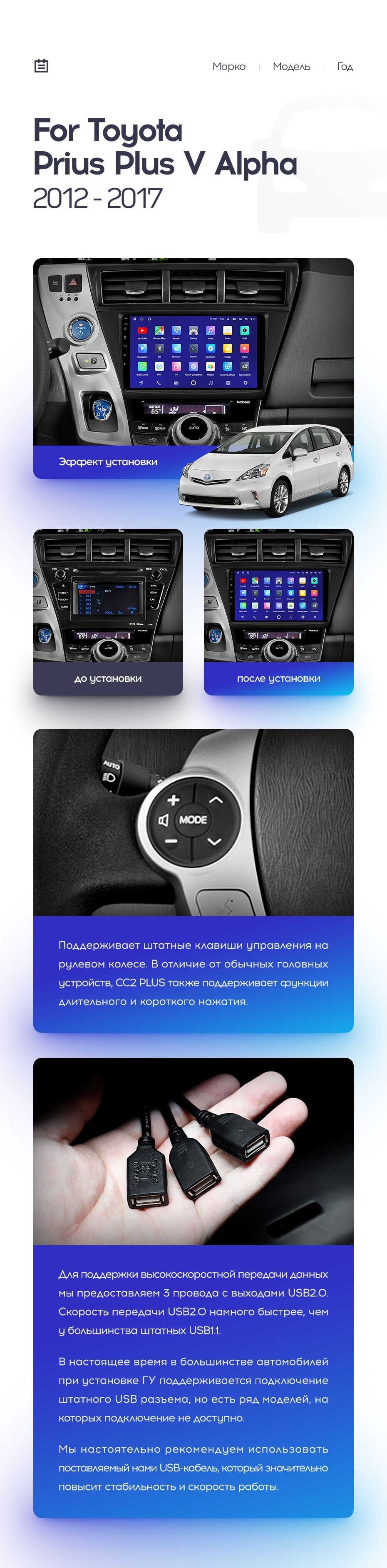 Полный комплект установки магнитолы Teyes с рамкой и проводкой можно выбрать в каталоге штатных магнитол Toyota Prius Plus V Alpha LHD RHD (2012-2017).